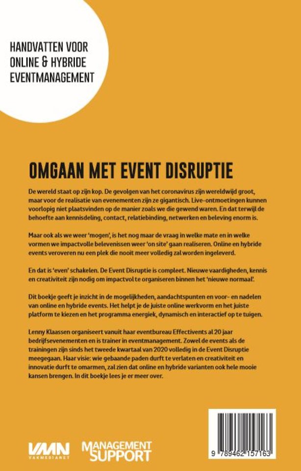 Lenny Klaassen organiseert vanuit haar eventbureau Effectivents al 20 jaar bedrijfsevenementen en is trainer in eventmanagement. Zowel de events als de trainingen zijn sinds het tweede kwartaal van 2020 volledig in de Event Disruptie meegegaan. Haar visie: wie gebaande paden durft te verlaten en creativiteit en innovatie durft te omarmen, zal zien dat online en hybride varianten ook hele mooie kansen brengen. In dit boekje lees je er meer over.
