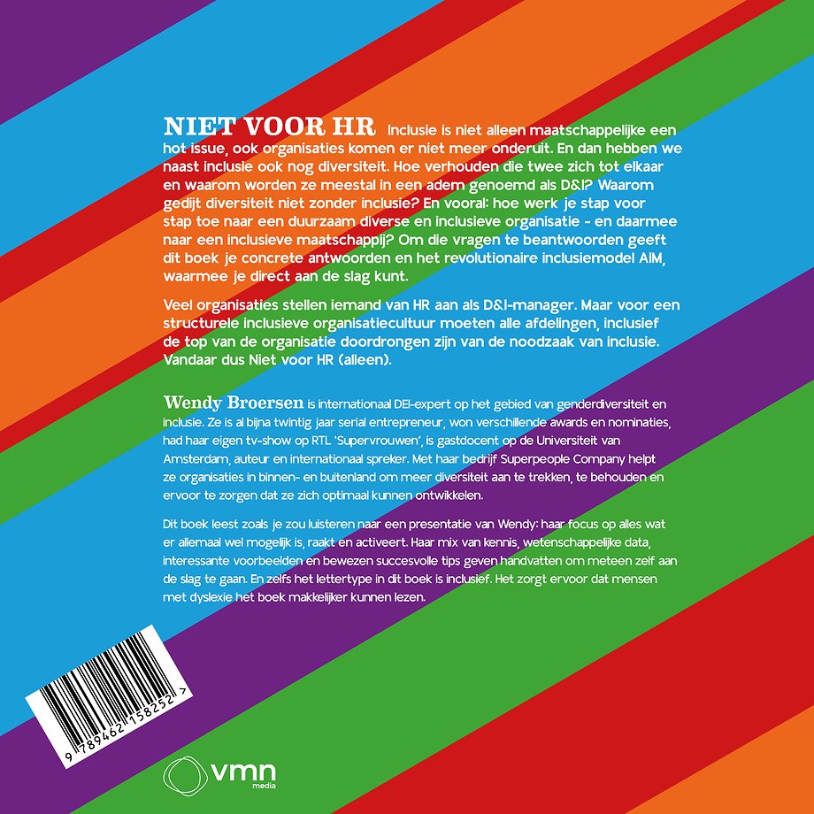 Concrete antwoorden op bovenstaande (en andere) D&I vragen en als houvast het revolutionaire inclusiemodel AIM, waarmee je direct aan de slag kunt. Veel organisaties stellen iemand van HR aan als D&I-manager. Maar voor een inclusieve organisatiecultuur moeten alle afdelingen, inclusief de top van de organisatie doordrongen zijn van de noodzaak van diversiteit en inclusie. Vandaar de titel: Niet voor HR.
