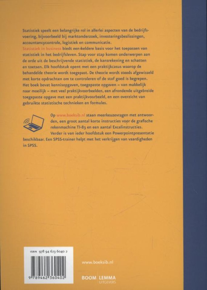 'Statistiek in business' biedt een heldere basis voor het toepassen van statistiek in het bedrijfsleven. Stap voor stap komen onderwerpen aan de orde uit de beschrijvende statistiek, de kansrekening en schatten en toetsen. Elk hoofdstuk opent met een praktijkcasus waarop de behandelde theorie wordt toegepast. De theorie wordt steeds afgewisseld met korte opdrachten om te controleren of de stof goed is begrepen.