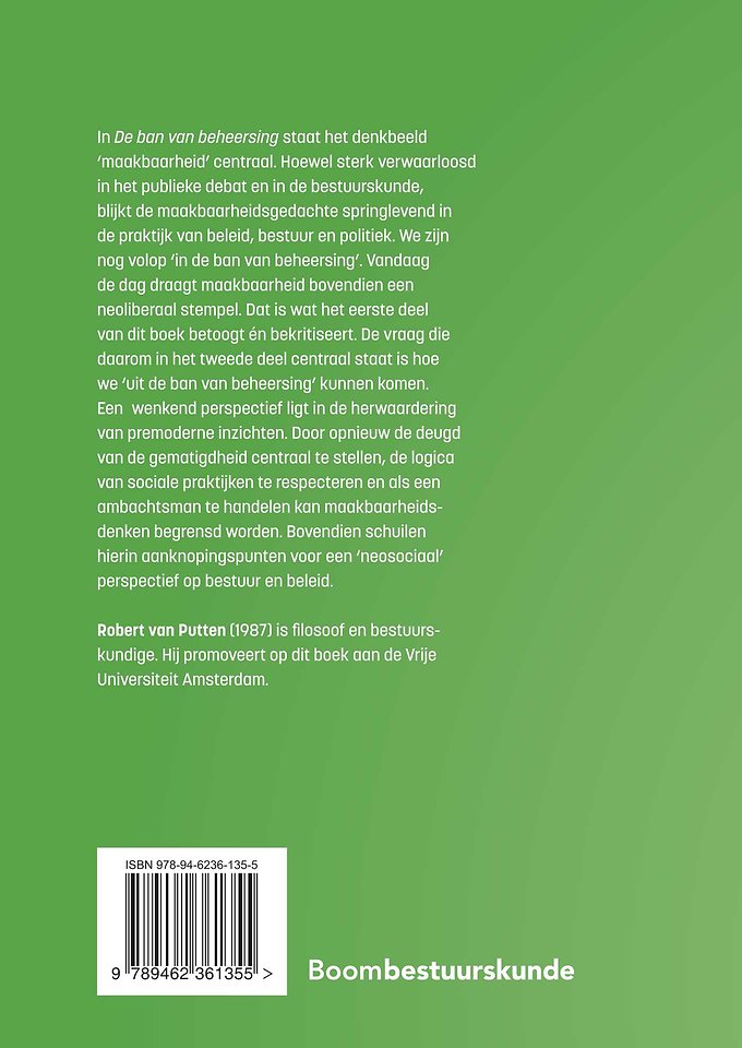 In 'De ban van beheersing' staat het denkbeeld ‘maakbaarheid’ centraal. Hoewel sterk verwaarloosd in het publieke debat en in de bestuurskunde, blijkt de maakbaarheidsgedachte springlevend in de praktijk van beleid, bestuur en politiek. We zijn nog volop ‘in de ban van beheersing’. Vandaag de dag draagt maakbaarheid bovendien een neoliberaal stempel. Dat is wat het eerste deel van dit boek betoogt én bekritiseert. De vraag die daarom in het tweede deel centraal staat is hoe we ‘uit de ban van beheersing’ kunnen komen.