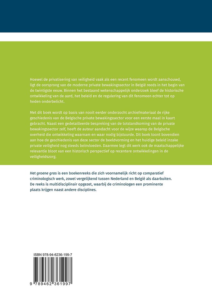 Met dit boek wordt op basis van nooit eerder onderzocht archiefmateriaal deze rijke geschiedenis voor een eerste maal in kaart gebracht. Naast een gedetailleerde bespreking van de totstandkoming van de private bewakingssector zelf, heeft de auteur aandacht voor de wijze waarop de Belgische overheid die ontwikkeling waarnam en waar nodig bijstuurde. Dit boek toont bovendien aan hoe de geschiedenis van deze sector de beeldvorming en het huidige beleid inzake private veiligheid nog steeds beïnvloeden. Daarmee legt dit origineel werk ook de maatschappelijke relevantie bloot van een historisch perspectief op recentere ontwikkelingen in de veiligheidszorg.