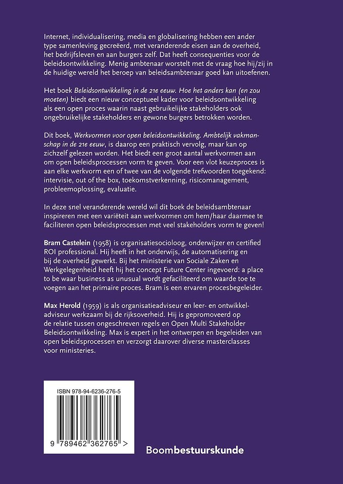 Dit boek, 'Werkvormen voor open beleidsontwikkeling. Ambtelijk vakmanschap in de 21e eeuw', is daarop een praktisch vervolg, maar kan op zichzelf gelezen worden. Het biedt een groot aantal werkvormen aan om open beleidsprocessen vorm te geven. Voor een vlot keuzeproces is aan elke werkvorm een of twee van de volgende trefwoorden toegekend: intervisie, out of the box, toekomstverkenning, risicomanagement, probleemoplossing, evaluatie.