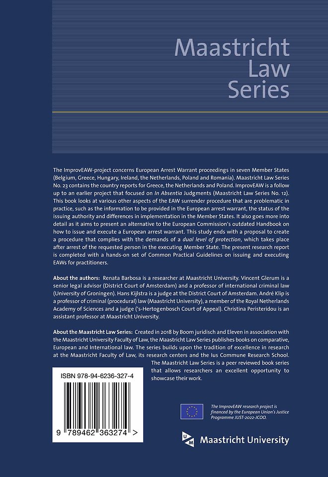 The ImprovEAW-project concerns European Arrest Warrant proceedings in seven Member States (Belgium, Greece, Hungary, Ireland, the Netherlands, Poland and Romania). Maastricht Law Series No. 23 contains the country reports for Greece, the Netherlands and Poland. ImprovEAW is a follow up to an earlier project that focused on In Absentia Judgments (Maastricht Law Series No. 12).