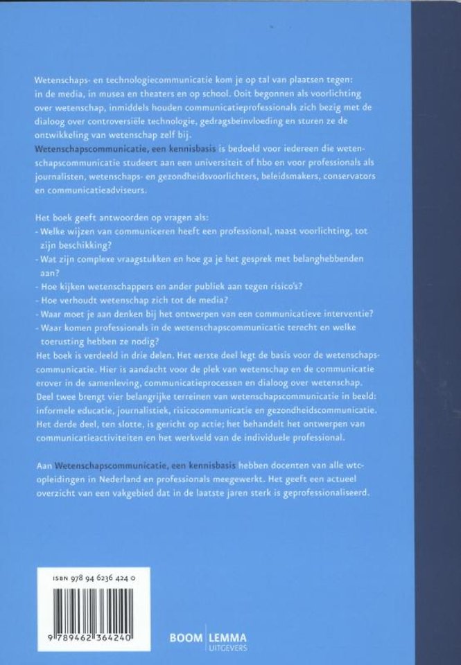 Aan 'Wetenschapscommunicatie, een kennisbasis' hebben docenten van alle wtc-opleidingen in Nederland en professionals meegewerkt. Het geeft een actueel overzicht van een vakgebied dat in de laatste jaren sterk is geprofessionaliseerd.
