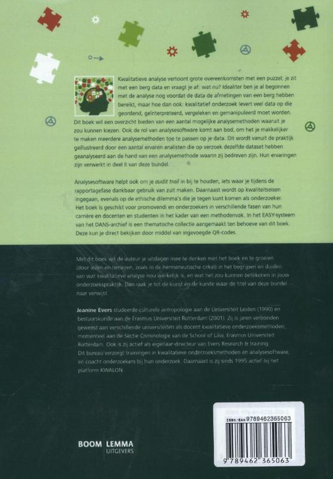 Analysesoftware helpt ook om je audit trail in bij te houden, iets waar je tijdens de rapportagefase dankbaar gebruik van zult maken. Daarnaast wordt op kwaliteitseisen ingegaan, evenals op de ethische dilemma's die je tegen kunt komen als onderzoeker. Het boek is geschikt voor promovendi en onderzoekers in verschillende fasen van hun carrière en docenten en studenten in het kader van een methodenvak. In het EASY-systeem van het DANS-archief is een thematische collectie aangemaakt ten behoeve van dit boek. Deze kun je direct bekijken door middel van ingevoegde QR-codes.