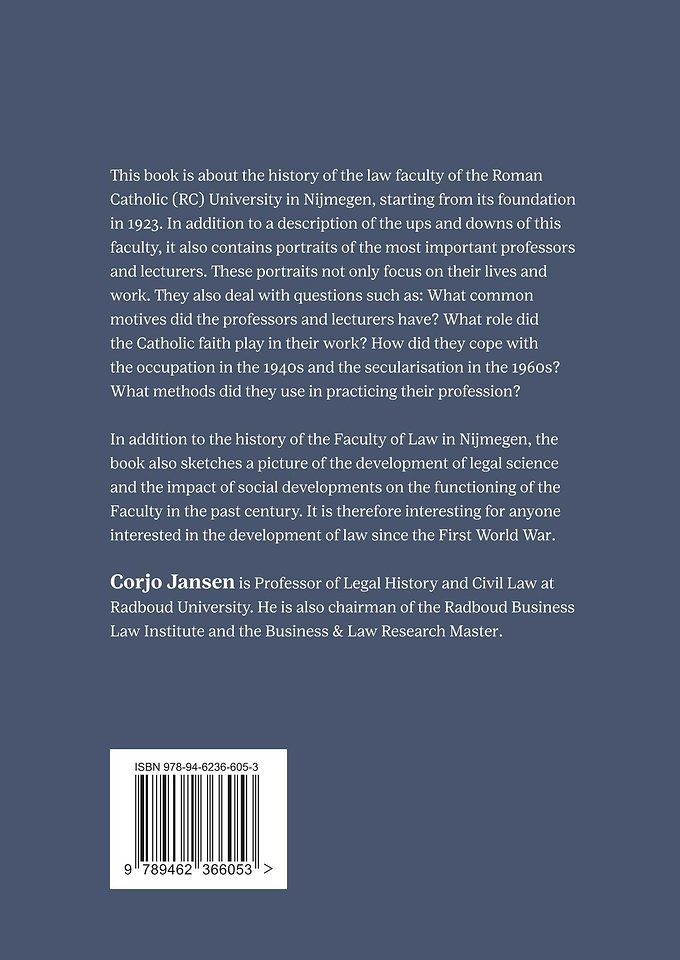 This book is about the history of the law faculty of the Roman Catholic (RC) University in Nijmegen, starting from its foundation in 1923. In addition to a description of the ups and downs of this faculty, it also contains portraits of the most important professors and lecturers. These portraits not only focus on their lives and work. They also deal with questions such as: What common motives did the professors and lecturers have? What role did the Catholic faith play in their work? How did they cope with the occupation in the 1940s and the secularisation in the 1960s? What methods did they use in practicing their profession?