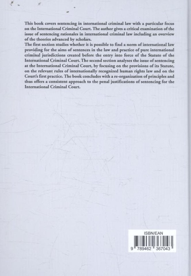 The work opens with a critical examination of the issue of sentencing rationales in international criminal law and with an overview of the theories advanced by scholars. To pursue its main objective, the book is then divided into two sections. The first section studies whether it is possible to find a norm of international law providing for the aims of sentences in the law and practice of pure international criminal jurisdictions created before the entry into force of the Statute of the International Criminal Court, namely the Nuremberg and Tokyo Tribunals and the two UN ad hoc Tribunals for the former Yugoslavia and Rwanda. The second section analyses the issue of sentencing at the International Criminal Court, by focusing on the provisions of its Statute, on the relevant rules of internationally recognized human rights law and on the Court's first practice. The book ends with a re-organization of the principles emerged throughout the research. The resulting principled system suggests a consistent approach to the penal justifications of sentencing for the International Criminal Court.