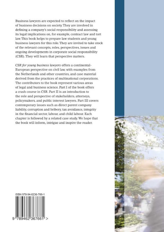 CSR for young business lawyers offers a continental-European perspective on civil law, with examples from the Netherlands and other countries, and case material derived from the practices of multinational corporations. The contributors to the book represent various areas of legal and business science. Part I of the book offers a crash course in CSR. Part II is an introduction to the role and perspective of stakeholders, attorneys, policymakers, and public interest lawyers. Part III covers contemporary issues such as direct parent company liability, corruption and bribery, tax avoidance, integrity in the financial sector, labour, and child labour. Each chapter is followed by a related case study. We hope that the book will inform, intrigue and inspire the reader.