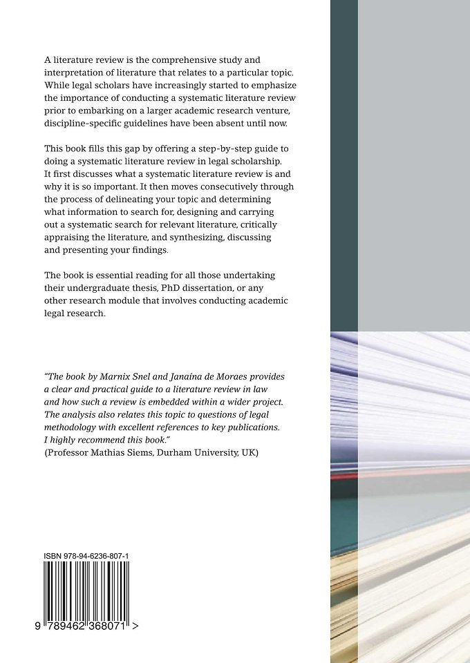 This book fills this gap by offering a step-by-step guide to doing a systematic literature review in legal scholarship. It first discusses what a systematic literature review is and why it is so important. It then moves consecutively through the process of delineating your topic and determining what information to search for, designing and carrying out a systematic search for relevant literature, critically appraising the literature, and synthesizing, discussing and presenting your findings.
