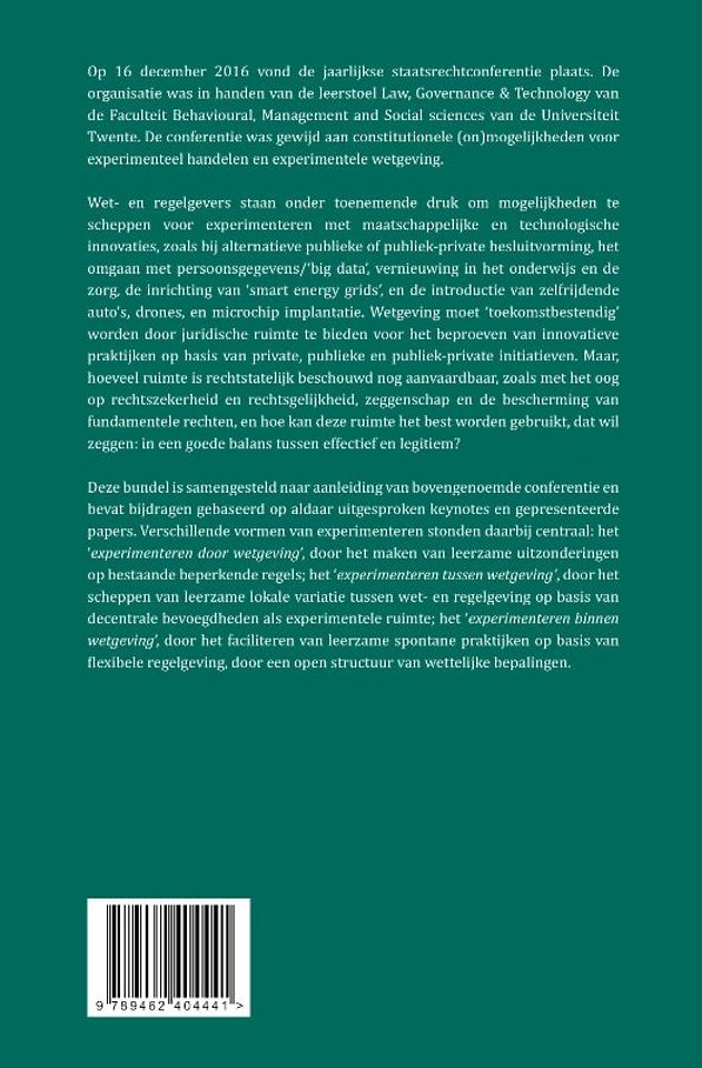 Wet- en regelgevers staan onder toenemende druk om mogelijkheden te scheppen voor experimenteren met maatschappelijke en technologische innovaties, zoals bij alternatieve publieke of publiek-private besluitvorming, het omgaan met persoonsgegevens/'big data', vernieuwing in het onderwijs en de zorg, de inrichting van 'smart energy grids', en de introductie van zelfrijdende auto's, drones, en microchip implantatie. Wetgeving moet 'toekomstbestendig' worden door juridische ruimte te bieden voor het beproeven van innovatieve praktijken op basis van private, publieke en publiek-private initiatieven. Maar, hoeveel ruimte is rechtstatelijk beschouwd nog aanvaardbaar, zoals met het oog op rechtszekerheid en rechtsgelijkheid, zeggenschap en de bescherming van fundamentele rechten, en hoe kan deze ruimte het best worden gebruikt, dat wil zeggen: in een goede balans tussen effectief en legitiem?
