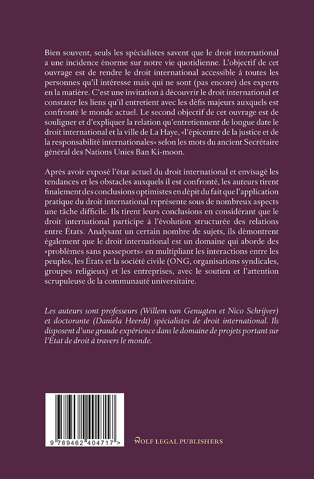 Bien souvent, seuls les spécialistes savent que le droit international a une incidence énorme sur notre vie quotidienne. L’objectif de cet ouvrage est de rendre le droit international accessible à toutes les personnes qu’il intéresse mais qui ne sont (pas encore) des experts en la matière. C’est une invitation à découvrir le droit international et constater les liens qu’il entretient avec les défis majeurs auxquels est confronté le monde actuel. Le second objectif de cet ouvrage est de souligner et d’expliquer la relation qu’entretiennent de longue date le droit international et la ville de La Haye, «l’épicentre de la justice et de la responsabilité internationales» selon les mots du ancient Secrétaire général des Nations Unies Ban Ki-moon.