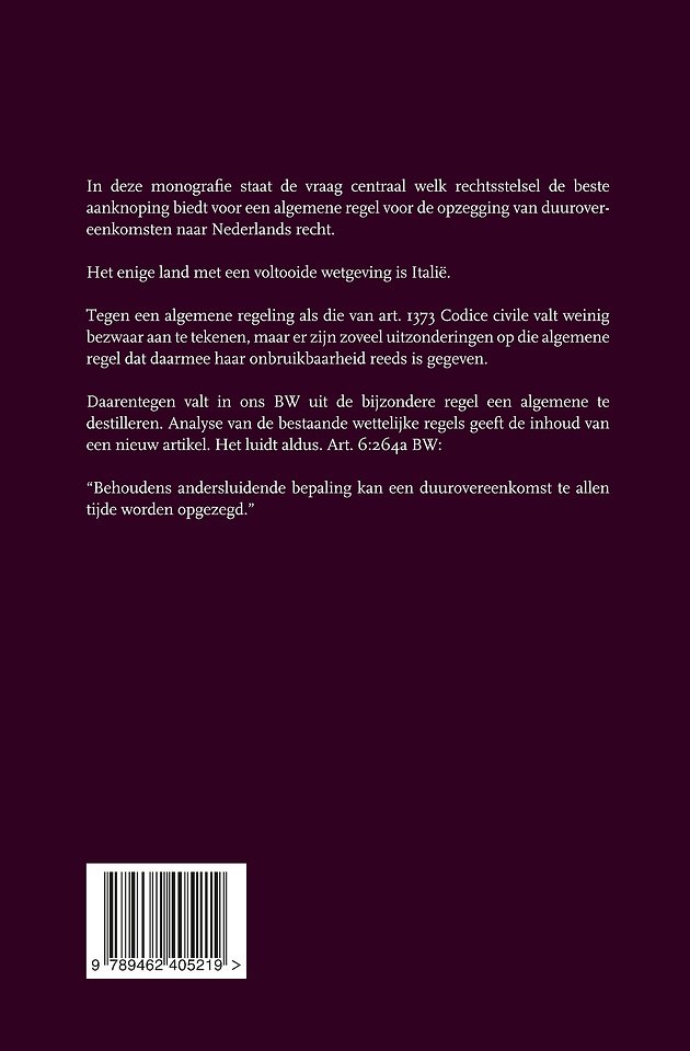 In deze monografie staat de vraag centraal welk rechtsstelsel de beste aanknoping biedt voor een algemene regel voor de opzegging van duurovereenkomsten naar Nederlands recht.