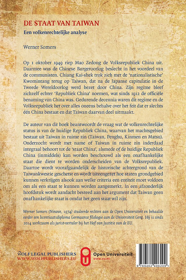 De auteur van dit boek beantwoordt de vraag wat de volkenrechtelijke status is van de huidige Republiek China, waarvan het machtsgebied bestaat uit Taiwan in ruime zin (Taiwan, Penghu, Kinmen en Matsu).