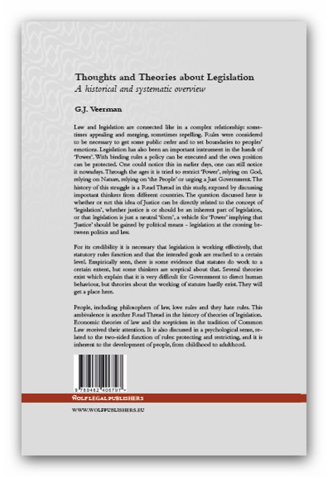 Through the ages it is tried to restrict ‘Power’, relying on God, relying on Nature, relying on ‘the People’ or urging a Just Government. The history of this struggle is a Read Thread in this study, exposed by discussing important thinkers from different countries. The question discussed here is whether or not this idea of Justice can be directly related to the concept of ‘legislation’, whether justice is or should be an inherent part of legislation, or that legislation is just a neutral ‘form’, a vehicle for ‘Power’ implying that ‘Justice’ should be gained by political means - legislation at the crossing be-tween politics and law.