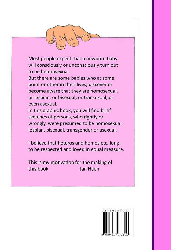 Most people expect that a newborn baby will consciously turn out to be heterosexual. But there are some babies who at some point or other in their lives, discover or become aware that they are homosexual, or lesbian, or bisexual, or transexual, or even asexual. In this graphic book, you will find brief sketches of persons, who rightly or wrongly, were presumed to be homosexual, lesbian, bisexual, transexual or asexual. I believe that heteros and homos etc. long to be respected and loved in equal measure. This is my motivation for the making of this book. ~ Jan Haen