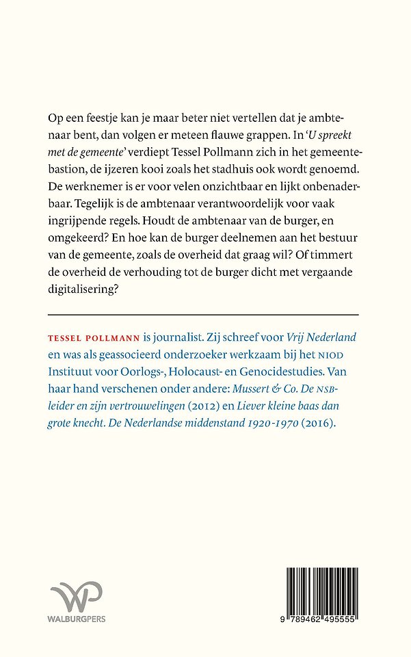 In 'U spreekt met de gemeente' verdiept Tessel Pollmann zich in het gemeentebastion, de ijzeren kooi zoals het stadhuis ook wordt genoemd. De werknemer is er voor velen onzichtbaar en lijkt onbenaderbaar. Tegelijk is hij verantwoordelijk voor vaak ingrijpende regels.
