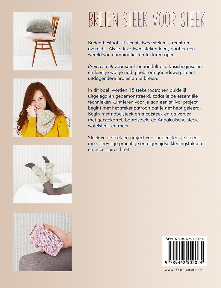Ribbelsteek, tricotsteek, boordsteek, ribbelboordsteek, dubbele gerstekorrel, gebroken boordsteek, wafelsteek, mandvlechtsteek, Andalusische steek. Eigenlijk bestaat breien uit slechts twee steken: recht en averecht. Als je deze twee steken kent, kun je alle hierboven genoemde steken maken en gaat er een wereld van combinaties en texturen voor je open. Breien steek voor steek behandelt alle basisbeginselen en leert je wat je nodig hebt om gaandeweg steeds uitdagendere projecten te breien.
