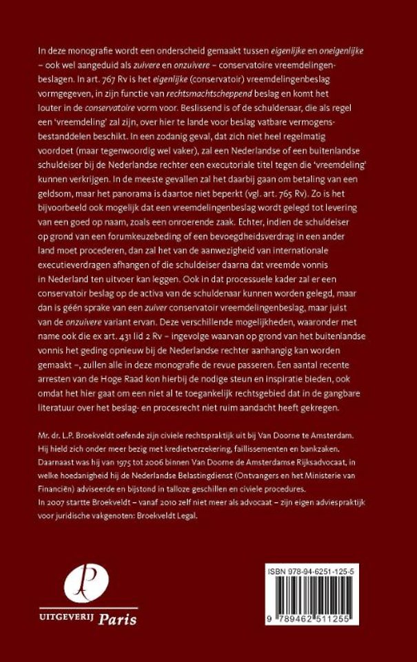 Ook in dat processuele kader zal er een conservatoir beslag op de activa van de schuldenaar kunnen worden gelegd, maar dan is géén sprake van een zuiver conservatoir vreemdelingenbeslag, maar juist van de onzuivere variant ervan. Deze verschillende mogelijkheden, waaronder met name ook die ex art. 431 lid 2 Rv – ingevolge waarvan op grond van het buitenlandse vonnis het geding opnieuw bij de Nederlandse rechter aanhangig kan worden gemaakt –, zullen alle in deze monografie de revue passeren. Een aantal recente arresten van de Hoge Raad kon hierbij de nodige steun en inspiratie bieden, ook omdat het hier gaat om een niet al te toegankelijk rechtsgebied dat in de gangbare literatuur over het beslag- en procesrecht niet ruim aandacht heeft gekregen.