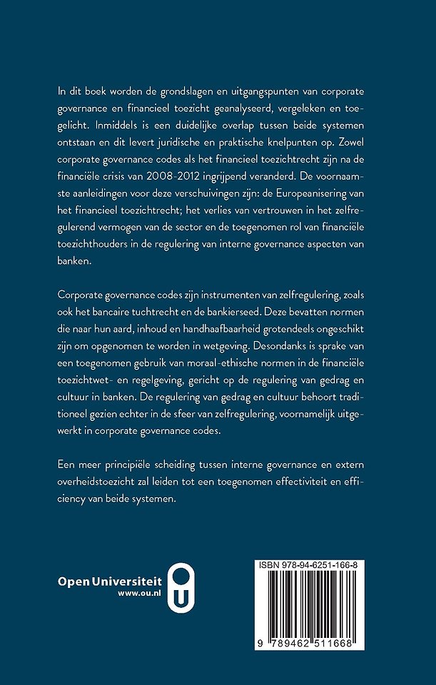 In dit boek worden de grondslagen en uitgangspunten van corporate governance en financieel toezicht geanalyseerd, vergeleken en toegelicht. Inmiddels is een duidelijke overlap tussen beide systemen ontstaan en dit levert juridische en praktische knelpunten op. Zowel corporate governance codes als het financieel toezichtrecht zijn na de financiële crisis van 2008-2012 ingrijpend veranderd. De voornaamste aanleidingen voor deze verschuivingen zijn: de Europeanisering van het financieel toezichtrecht; het verlies van vertrouwen in het zelfregulerend vermogen van de sector en de toegenomen rol van financiële toezichthouders in de regulering van interne governance aspecten van banken.