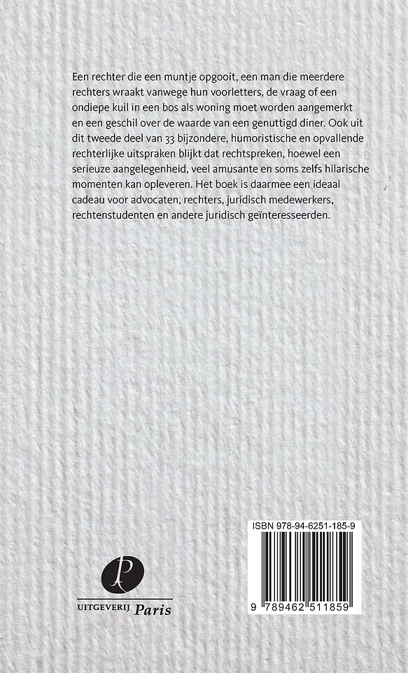 Ook uit dit tweede deel van 33 bijzondere, humoristische en opvallende rechterlijke uitspraken blijkt dat rechtspreken, hoewel een serieuze aangelegenheid, veel amusante en soms zelfs hilarische momenten kan opleveren. Het boek is daarmee een ideaal cadeau voor advocaten, rechters, juridisch medewerkers, rechtenstudenten en andere juridisch geïnteresseerden.
