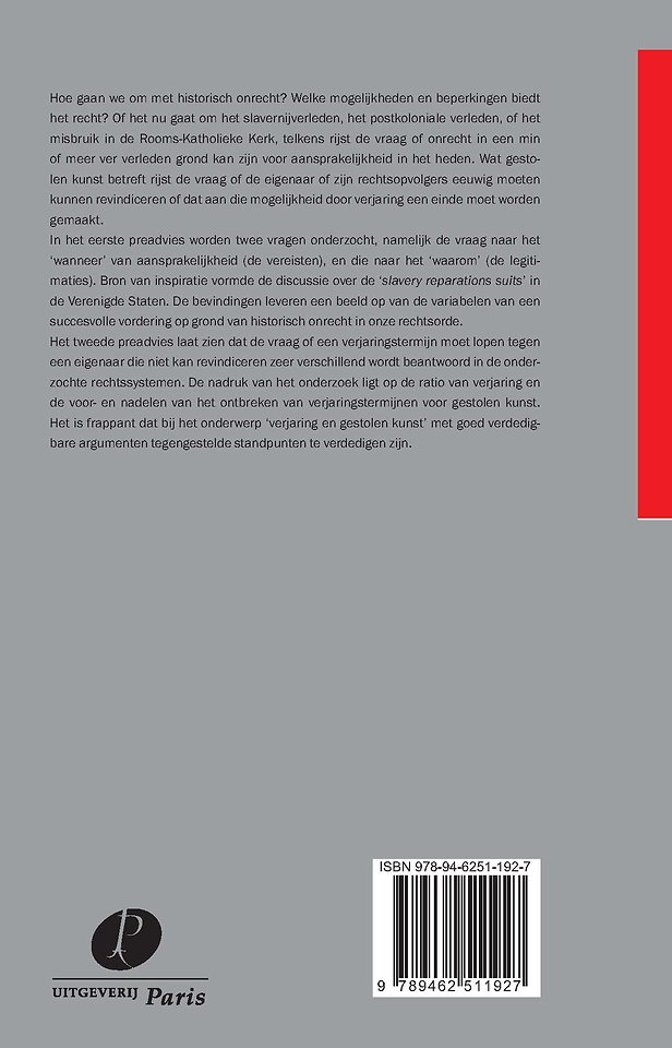 Hoe gaan we om met historisch onrecht? Welke mogelijkheden en beperkingen biedt het recht? Of het nu gaat om het slavernijverleden, het postkoloniale verleden, of het misbruik in de Rooms-Katholieke Kerk, telkens rijst de vraag of onrecht in een min of meer ver verleden grond kan zijn voor aansprakelijkheid in het heden. Wat gestolen kunst betreft rijst de vraag of de eigenaar of zijn rechtsopvolgers eeuwig moeten kunnen revindiceren of dat aan die mogelijkheid door verjaring een einde moet worden gemaakt.