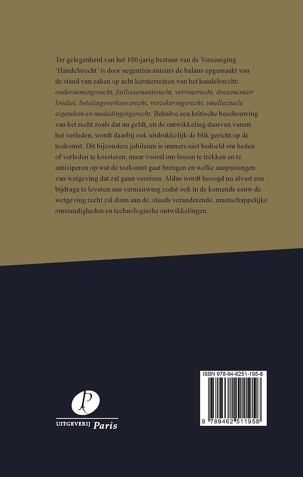 Ter gelegenheid van het 100-jarig bestaan van de Vereeniging ‘Handelsrecht’ is door negentien auteurs de balans opgemaakt van de stand van zaken op acht kernterreinen van het handelsrecht: ondernemingsrecht, faillissementsrecht, vervoerrecht, documentair krediet, betalingsverkeersrecht, verzekeringsrecht, intellectuele eigendom en mededingingsrecht.