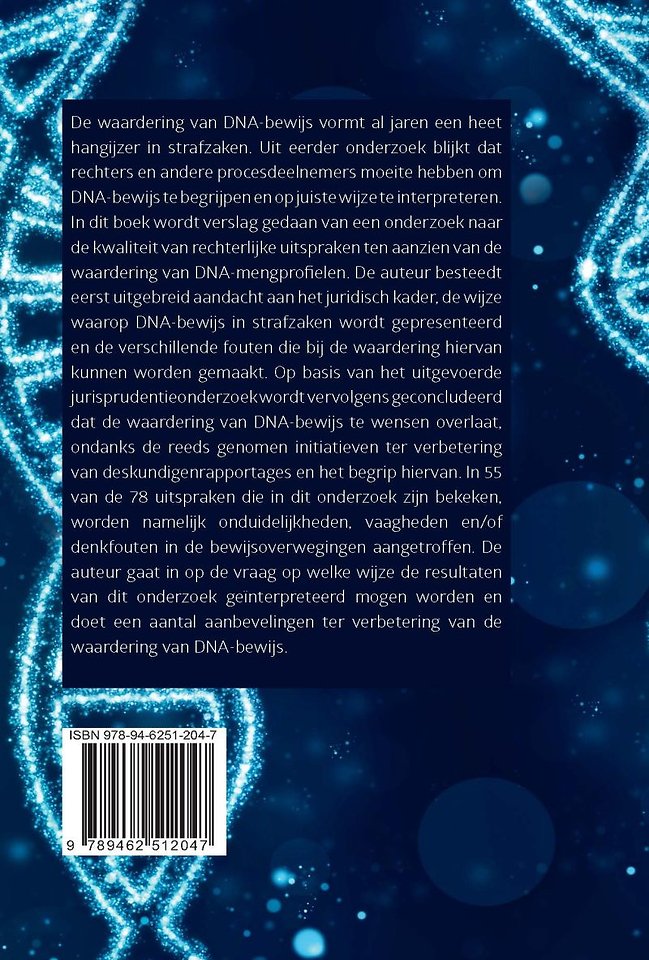 De waardering van DNA-bewijs vormt al jaren een heet hangijzer in strafzaken. Uit eerder onderzoek blijkt dat rechters en andere procesdeelnemers moeite hebben om DNA-bewijs te begrijpen en op juiste wijze te interpreteren. In dit boek wordt verslag gedaan van een onderzoek naar de kwaliteit van rechterlijke uitspraken ten aanzien van de waardering van DNA-mengprofielen.