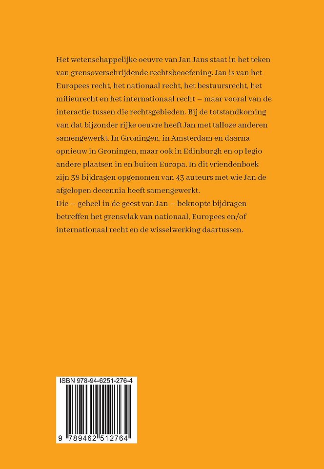Het wetenschappelijke oeuvre van Jan Jans, dat zich tot op heden over zo’n 35 jaar uitstrekt, staat in het teken van grensoverschrijdende rechtsbeoefening. Jan is van het Europees recht, het nationaal recht, het bestuursrecht, het milieurecht en het internationaal recht, maar vooral van de interactie tussen die rechtsgebieden.