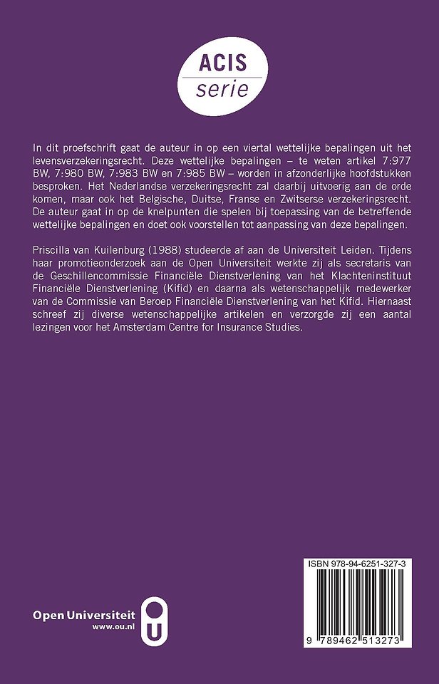 In dit proefschrift gaat de auteur in op een viertal wettelijke bepalingen uit het levensverzekeringsrecht. Deze wettelijke bepalingen – te weten artikel 7:977 BW, 7:980 BW, 7:983 BW en 7:985 BW – worden in afzonderlijke hoofdstukken besproken. Het Nederlandse verzekeringsrecht zal daarbij uitvoerig aan de orde komen, maar ook het Belgische, Duitse, Franse en Zwitserse verzekeringsrecht.
