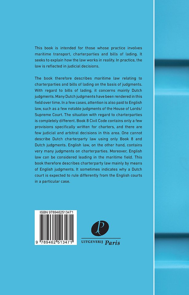 The book therefore describes maritime law relating to charterparties and bills of lading on the basis of judgments. With regard to bills of lading, it concerns mainly Dutch judgments. Many Dutch judgments have been rendered in this field over time. In a few cases, attention is also paid to English law, such as a few notable judgments of the House of Lords/Supreme Court. The situation with regard to charterparties is completely different. Book 8 Civil Code contains only a few provisions specifically written for charters, and there are few judicial and arbitral decisions in this area. One cannot describe Dutch charterparty law using only Book 8 and Dutch judgments.