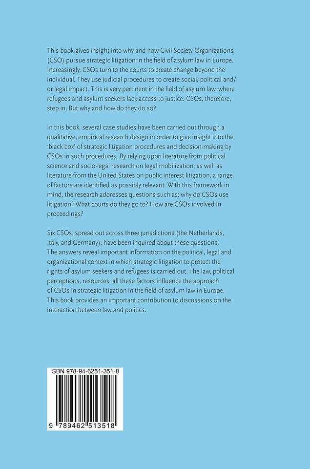 Six CSOs, spread out across three jurisdictions (the Netherlands, Italy, and Germany), have been inquired about these questions. The_answers reveal important information on the political, legal and organizational context in which strategic litigation to protect the rights of asylum seekers and refugees is carried out. The law, political perceptions, resources, all these factors infl uence the approach of CSOs in strategic litigation in the fi eld of asylum law in Europe. This book provides an important contribution to discussions on the interaction between law and politics.