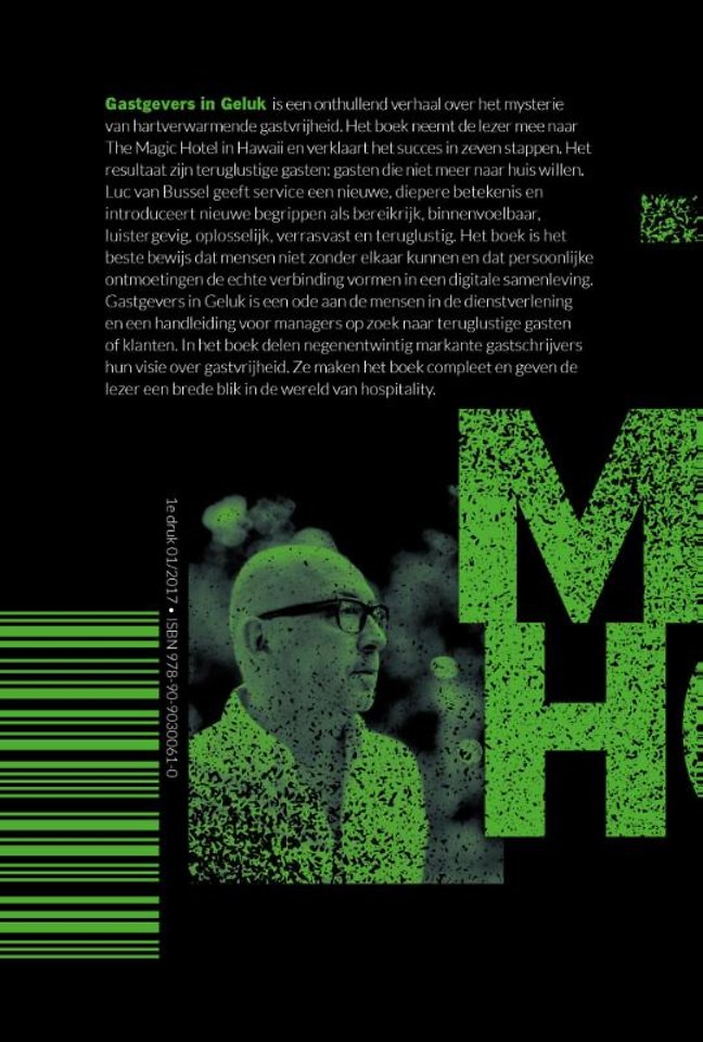 Meer over Luc van BusselGastgevers in Geluk is een onthullend verhaal over het mysterie van hartverwarmende gastvrijheid. Het boek neemt de lezer mee naar The Magic Hotel in Hawaii en verklaart het succes in zeven stappen. Het resultaat? Teruglustige Gasten! Gasten die niet meer naar huis willen.