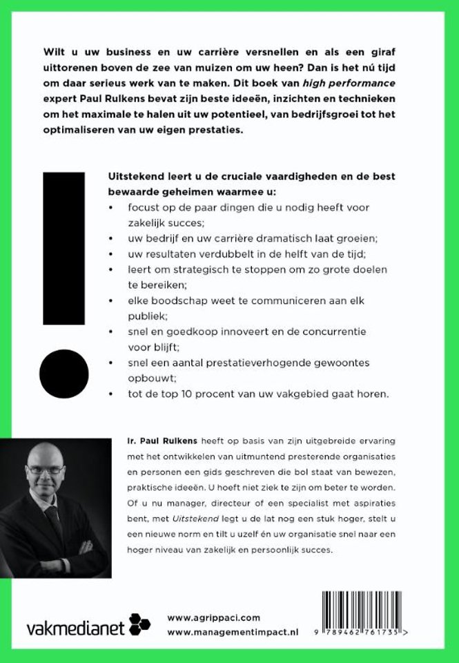 Ir. Paul Rulkens heeft op basis van zijn uitgebreide ervaring met het ontwikkelen van uitmuntend presterende organisaties en personen een gids geschreven die bol staat van bewezen, praktische ideeën. U hoeft niet ziek te zijn om beter te worden. Of u nu manager, directeur of een specialist met aspiraties bent, met Uitstekend legt u de lat nog een stuk hoger, stelt u een nieuwe norm en tilt u uzelf én uw organisatie snel naar een hoger niveau van zakelijk en persoonlijk succes.