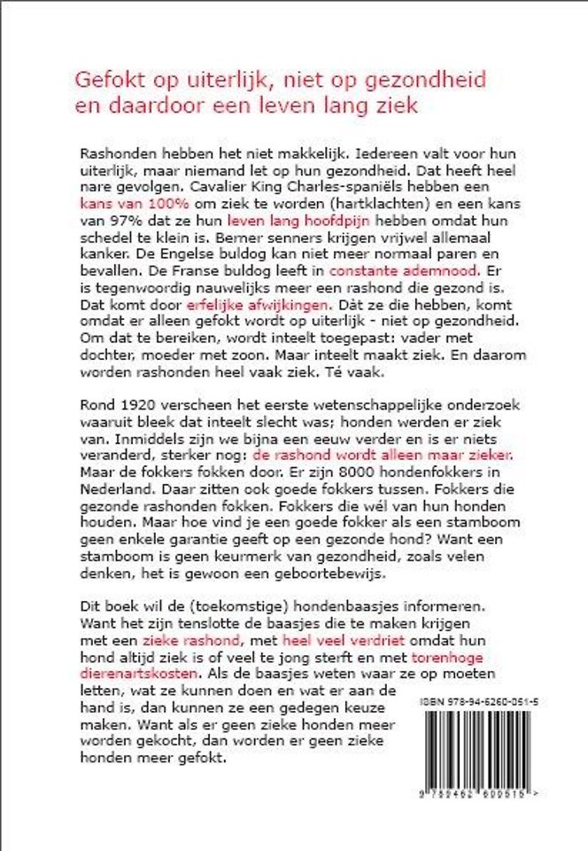 Dit boek wil de (toekomstige) hondenbaasjes informeren. Want het zijn tenslotte de baasjes die te maken krijgen met een zieke rashond, met heel veel verdriet omdat hun hond altijd ziek is of veel te jong sterft, en met torenhoge dierenartskosten. Als de baasjes weten waar ze op moeten letten, wat ze kunnen doen en wat er aan de hand is, dan kunnen ze een gedegen keuze maken.