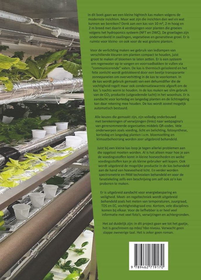 In dit boek gaan we een kleine hightech kas maken volgens de modernste inzichten. Maar wat zijn die inzichten dan wel en wat kunnen we bereiken? Denk aan een kas van 10 m2, 2 m hoog en 2 m breed met daarin 4 verdiepingen voor planten die groeien volgens het hydroponics systeem (NFT en DWC). De groeilagen zijn onderverdeeld in zaailingen, vegetatieve en generatieve groei. Er is ruimte voor kleine- en ook voor de wat grotere planten.