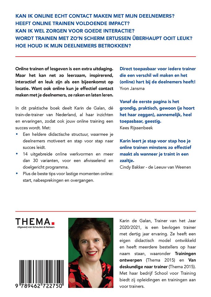 In dit praktische boek deelt Karin de Galan, dé train-de-trainer van Nederland, al haar inzichten en ervaringen, zodat ook jouw online training een succes wordt.