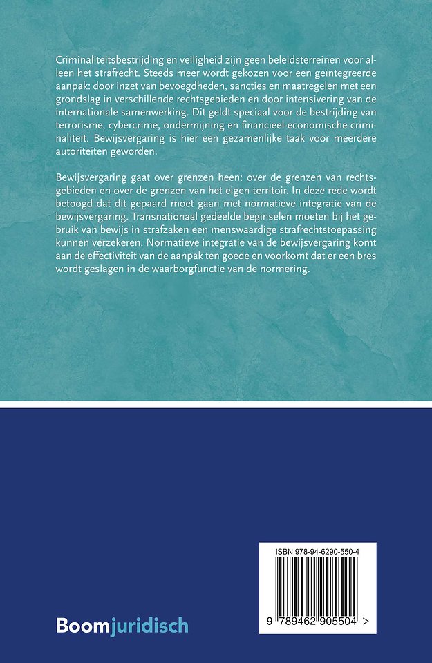 Bewijsvergaring is hier een gezamenlijke taak voor meerdere autoriteiten geworden. Bewijsvergaring gaat over grenzen heen: over de grenzen van rechtsgebieden en over de grenzen van het eigen territoir. In deze rede wordt betoogd dat dit gepaard moet gaan met normatieve integratie van de bewijsvergaring. Transnationaal gedeelde beginselen moeten bij het gebruik van bewijs in strafzaken een menswaardige strafrechtstoepassing kunnen verzekeren. Normatieve integratie van de bewijsvergaring komt aan de effectiviteit van de aanpak ten goede en voorkomt dat er een bres wordt geslagen in de waarborgfunctie van de normering.