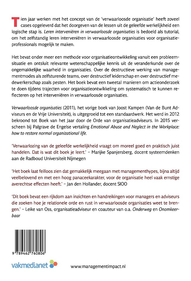 Meer over Joost KampenTien jaar werken met het concept van de ‘verwaarloosde organisatie’ heeft zoveel cases opgeleverd dat het doorgeven van de lessen uit de geleefde werkelijkheid een logische stap is. Leren interveniëren in verwaarloosde organisaties is bedoeld als tutorial, om het zelfstandig leren interveniëren in verwaarloosde organisaties voor organisatieprofessionals mogelijk te maken.