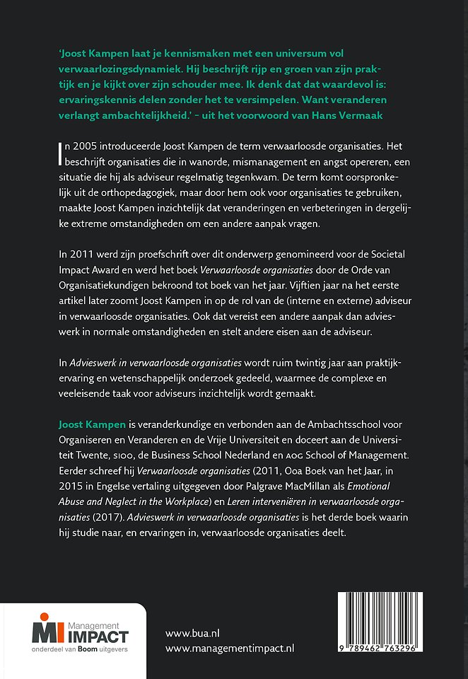 Meer over Joost Kampen‘Joost Kampen laat je kennismaken met een universum vol verwaarlozingsdynamiek. Hij beschrijft rijp en groen van zijn praktijk en je kijkt over zijn schouder mee. Ik denk dat dat waardevol is: ervaringskennis delen zonder het te versimpelen. Want veranderen verlangt ambachtelijkheid.’ – uit het voorwoord van Hans Vermaak