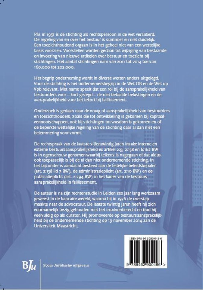 De rechtspraak van de laatste vijfentwintig jaren inzake interne en externe bestuursaansprakelijkheid ex artikel 2:9 en 6:162 BW is in ogenschouw genomen waarbij telkens is nagegaan of dat aldus ook toepasselijk is bij de al dan niet ondernemende stichting. In het bijzonder is aandacht besteed aan de feitelijke beleidsbepaler (art. 2:138/248 lid 7 BW), waar mede tegen de achtergrond van de rechtspraak over dat zelfde begrip in de Invorderingswet wordt geconcludeerd dat het terzijde schuiven van de formele bestuurder ten onrechte als eis wordt gesteld. Voorts wordt extra ingegaan op de administratieplicht (art. 2:10 BW) en de publicatieplicht (art. 2:394 BW) in het kader van de bestuursaansprakelijkheid in faillissement.