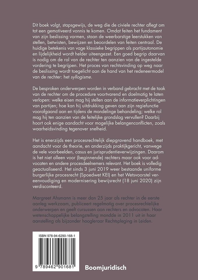 Centraal in dit boek staat de wijze waarop een civiel vonnis tot stand komt. De weerbarstige materie van de stelplicht, bewijslastverdeling en bewijswaardering loopt als een rode draad door het boek. Aandacht wordt geschonken aan de rol van de rechter, de afbakening tot de procespartijen en het daarbij behorende procesrechtelijke kader. Het is een praktijkgericht boek dat beoogt op systematische wijze het alledaagse (ambachtelijke) werk van de civiele rechter helder in kaart te brengen, waarbij het denkkader dat hij toepast bij het analyseren van de processtukken en het schrijven van het vonnis centraal staat.