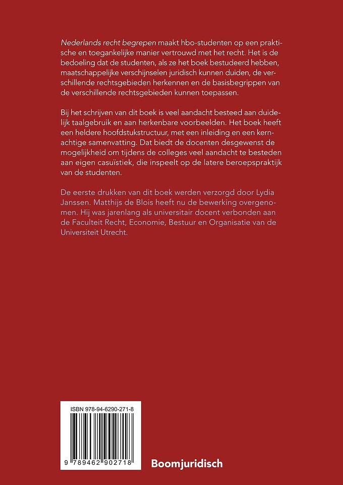 Dit boek is zeer geschikt als inleiding in het recht voor studenten in het hoger onderwijs (HBO-rechten, SJD), alsmede voor geïnteresseerden die een algemeen, compleet overzicht willen verkrijgen van het Nederlands recht.