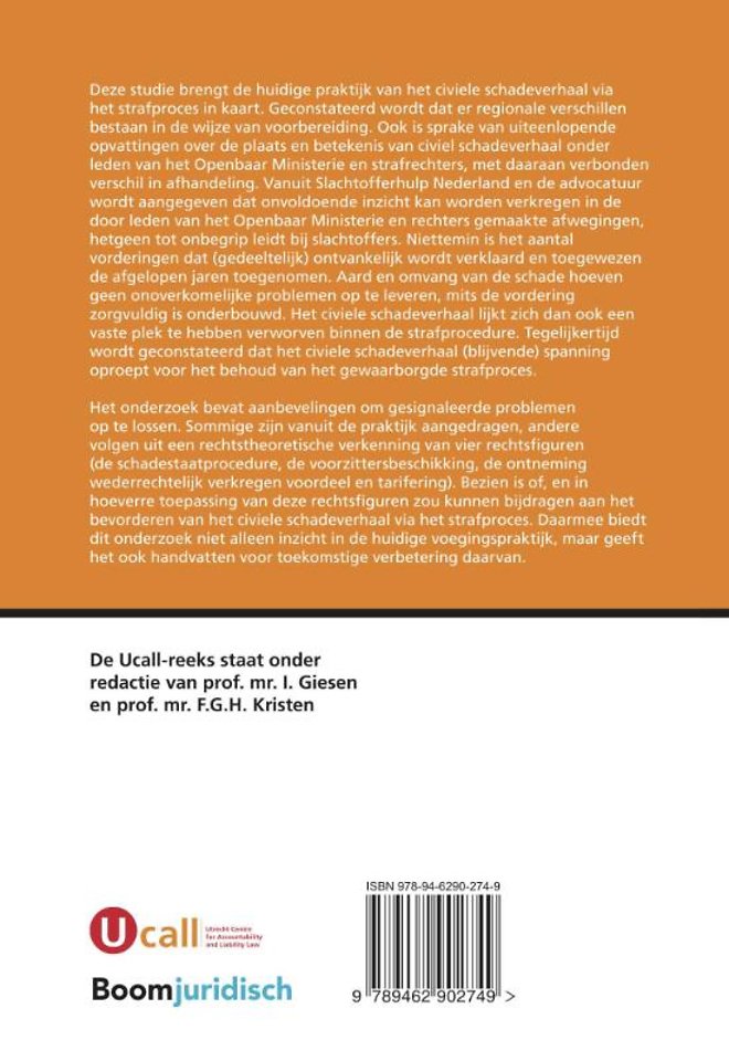 Deze studie brengt de huidige praktijk van het civiele schadeverhaal via het strafproces in kaart. Geconstateerd wordt dat er regionale verschillen bestaan in de wijze van voorbereiding. Ook is sprake van uiteenlopende opvattingen over de plaats en betekenis van civiel schadeverhaal onder leden van het Openbaar Ministerie en strafrechters, met daaraan verbonden verschil in afhandeling. Vanuit Slachtofferhulp Nederland en de advocatuur wordt aangegeven dat onvoldoende inzicht kan worden verkregen in de door leden van het Openbaar Ministerie en rechters gemaakte afwegingen, hetgeen tot onbegrip leidt bij slachtoffers. Niettemin is het aantal vorderingen dat (gedeeltelijk) ontvankelijk wordt verklaard en toegewezen de afgelopen jaren toegenomen. Aard en omvang van de schade hoeven geen onoverkomelijke problemen op te leveren, mits de vordering zorgvuldig is onderbouwd. Het civiele schadeverhaal lijkt zich dan ook een vaste plek te hebben verworven binnen de strafprocedure. Tegelijkertijd wordt geconstateerd dat het civiele schadeverhaal (blijvende) spanning oproept voor het behoud van het gewaarborgde strafproces.
