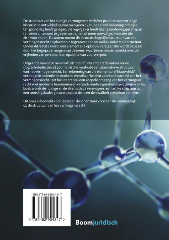 vermogensrecht. Het faciliteert ook een soepele omgang van het vermogensrecht met moderne fenomenen en veranderende eigendoms opvattingen. In het boek wordt de huidige en de alternatieve vermogensrechtelijke structuur aan een toetsingskader getoetst, opdat de lezer de kwaliteit ervan kan bepalen.