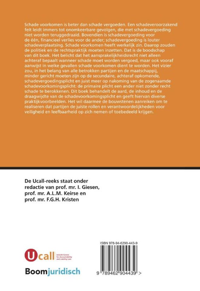 Daarop zouden de politiek en de rechtspraktijk moeten inzetten. Dat is de boodschap van dit boek. Het belicht dat het aansprakelijkheidsrecht niet alleen achteraf bepaalt wanneer schade moet worden vergoed, maar ook vooral aanwijst in welke gevallen schade voorkomen dient te worden. Het vizier zou, in het belang van alle betrokken partijen en de maatschappij, minder gericht moeten zijn op de secundaire, achteraf opkomende, schadevergoedingsplicht en juist meer op nakoming van de zogenaamde schadevoorkomingsplicht: de primaire plicht een ander niet zonder recht schade te berokkenen.