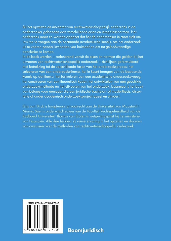 Gijs van Dijck is hoogleraar privaatrecht aan de Universiteit van Maastricht. Marnix Snel is onderwijsdirecteur van de Faculteit Rechtsgeleerdheid van de Radboud Universiteit. Thomas van Golen is wetgevingsjurist bij het ministerie van Financiën. Alle drie hebben zij ruime ervaring in het opzetten en doceren van cursussen over de methoden van rechtswetenschappelijk onderzoek.