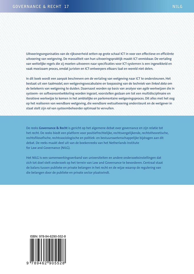In dit boek wordt een aanpak beschreven om de vertaling van wetgeving naar ICT te ondersteunen. Het bestaat uit een taalmodel, een wetgevingsvocabulaire en toepassing van de techniek van linked data om de betekenis van wetgeving te duiden. Daarnaast worden op basis van analyse van agile werkwijzen die in systeem- en softwareontwikkeling worden ingezet, voorstellen gedaan om tot een multidisciplinaire en iteratieve werkwijze te komen in het ambtelijke en parlementaire wetgevingsproces. Dit alles met het oog op het realiseren van wendbare wetgeving, die wendbare wetsuitvoering ondersteunt en de wetgever in staat stelt zijn rol van systeembeheerder optimaal te vervullen.
