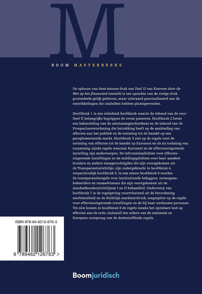 De diverse regels die voortvloeien uit de Verordening marktmisbruik zijn het onderwerp van hoofdstuk 6, toegespitst op de effectenuitgevende instellingen en de bij haar werkzame personen.Tot slot, hoofdstuk 7, waarin de regels inzake het openbare bod aan bod komen inclusief een schets van de nationale en Europese oorsprong van de desbetreffende regels.