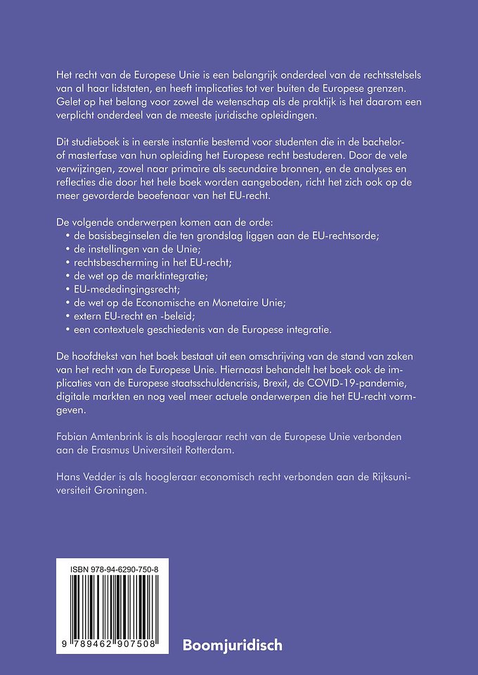 Dit studieboek is in eerste instantie bestemd voor studenten die in de bachelor- of masterfase van hun opleiding het Europese recht bestuderen. Daarnaast is het, door zijn diepgang en de vele verwijzingen, zeer bruikbaar voor de praktijk en de rechtswetenschap. Daarbij komen de volgende onderwerpen aan de orde: