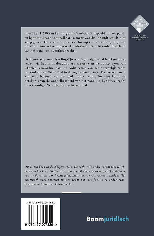 In artikel 3:230 van het Burgerlijk Wetboek is bepaald dat het panden hypotheekrecht ondeelbaar is, maar wat dit inhoudt wordt niet aangegeven. Deze studie probeert hierop een aanvulling te geven via een historisch-comparatief onderzoek naar de ondeelbaarheid van het pand- en hypotheekrecht.